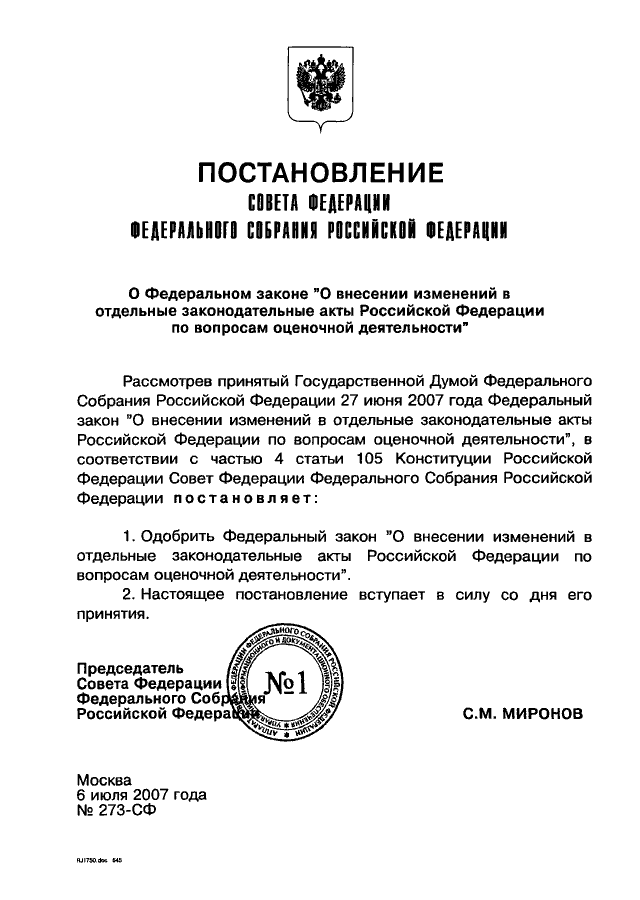 ПОСТАНОВЛЕНИЕ СФ ФС РФ от 06.07.2007 N 273-СФ
