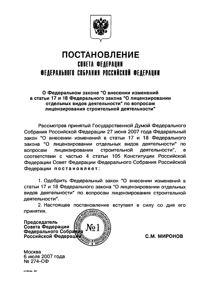 ПОСТАНОВЛЕНИЕ СФ ФС РФ от 06.07.2007 N 274-СФ