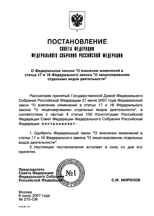 ПОСТАНОВЛЕНИЕ СФ ФС РФ от 06.07.2007 N 275-СФ