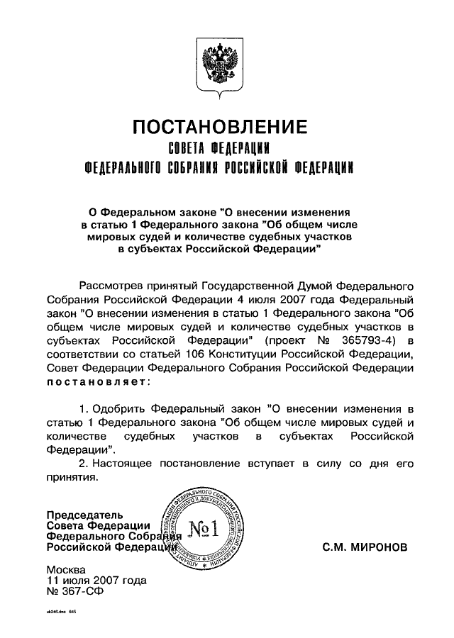 ПОСТАНОВЛЕНИЕ СФ ФС РФ от 11.07.2007 N 367-СФ