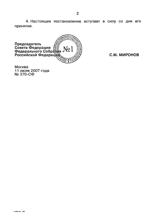 ПОСТАНОВЛЕНИЕ СФ ФС РФ от 11.07.2007 N 370-СФ