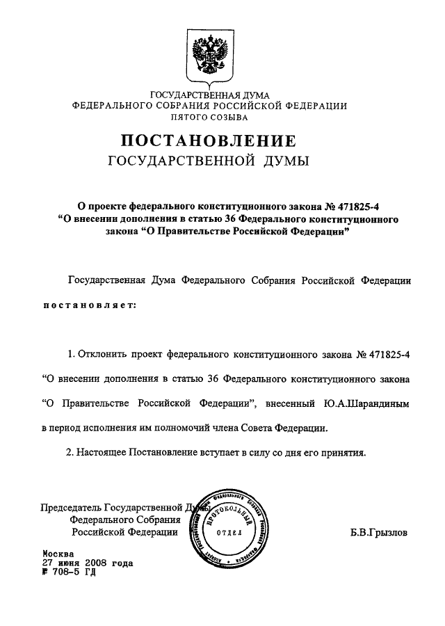 ПОСТАНОВЛЕНИЕ ГД ФС РФ от 27.06.2008 N 708-5 ГД