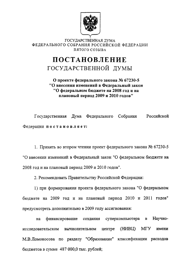 "О ПРОЕКТЕ ФЕДЕРАЛЬНОГО ЗАКОНА N 67230-5 "О ВНЕСЕНИИ ИЗМЕНЕНИЙ В ФЕДЕРАЛЬНЫЙ ЗАКОН "О ФЕДЕРАЛЬНОМ БЮДЖЕТЕ НА 2008 ГОД И НА ПЛАНОВЫЙ ПЕРИОД 2009 И 2010 ГОДОВ"