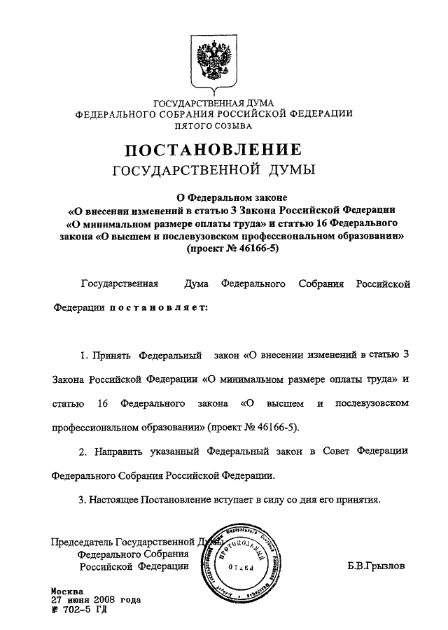 ПОСТАНОВЛЕНИЕ ГД ФС РФ от 27.06.2008 N 702-5 ГД