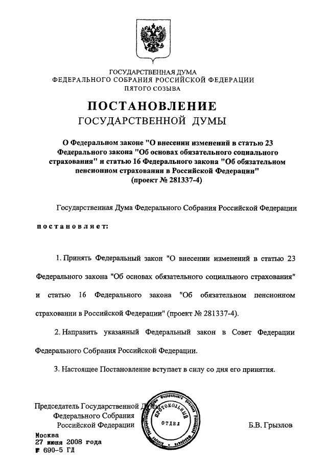 ПОСТАНОВЛЕНИЕ ГД ФС РФ от 27.06.2008 N 690-5 ГД
