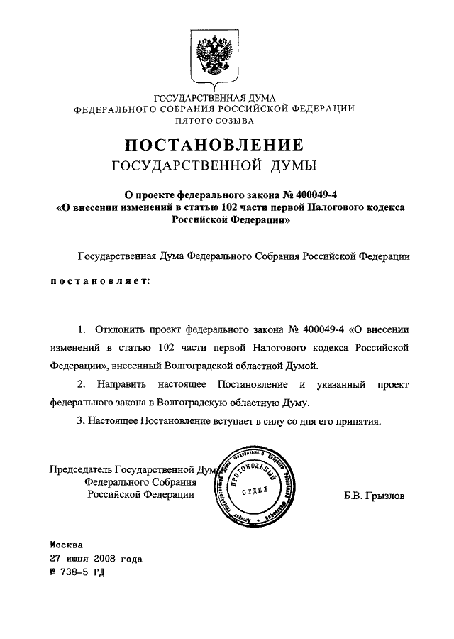 ПОСТАНОВЛЕНИЕ ГД ФС РФ от 27.06.2008 N 738-5 ГД