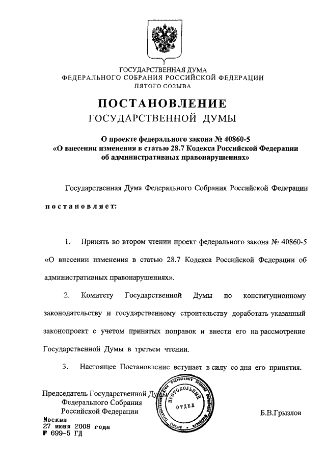 ПОСТАНОВЛЕНИЕ ГД ФС РФ от 27.06.2008 N 699-5 ГД