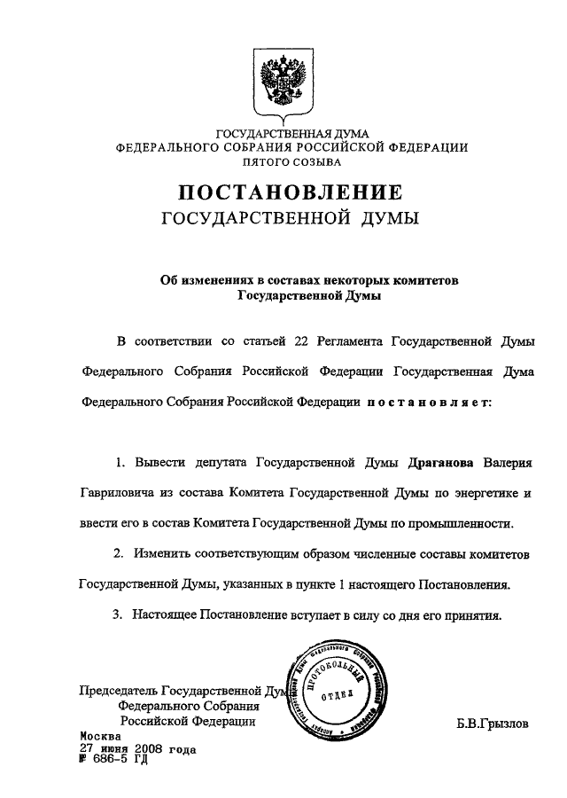 ПОСТАНОВЛЕНИЕ ГД ФС РФ от 27.06.2008 N 686-5 ГД