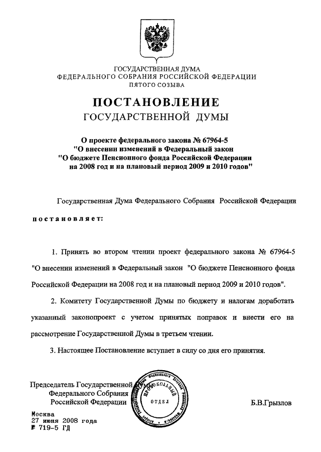 ПОСТАНОВЛЕНИЕ ГД ФС РФ от 27.06.2008 N 719-5 ГД