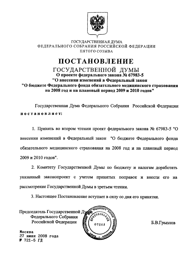 ПОСТАНОВЛЕНИЕ ГД ФС РФ от 27.06.2008 N 721-5 ГД