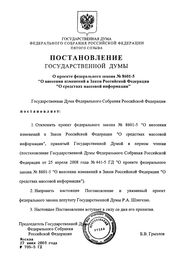 ПОСТАНОВЛЕНИЕ ГД ФС РФ от 27.06.2008 N 705-5 ГД