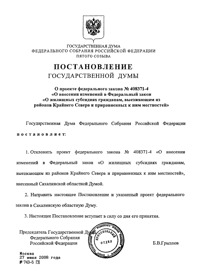 ПОСТАНОВЛЕНИЕ ГД ФС РФ от 27.06.2008 N 743-5 ГД