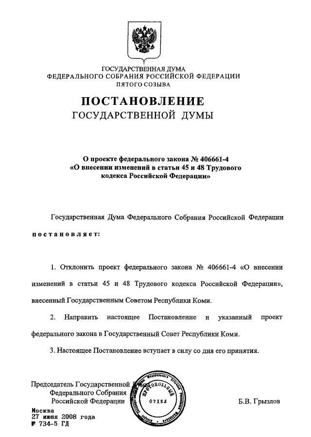 ПОСТАНОВЛЕНИЕ ГД ФС РФ от 27.06.2008 N 734-5 ГД