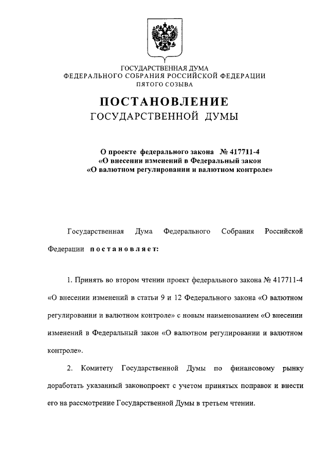 "О ПРОЕКТЕ ФЕДЕРАЛЬНОГО ЗАКОНА N 417711-4 "О ВНЕСЕНИИ ИЗМЕНЕНИЙ В ФЕДЕРАЛЬНЫЙ ЗАКОН "О ВАЛЮТНОМ РЕГУЛИРОВАНИИ И ВАЛЮТНОМ КОНТРОЛЕ"