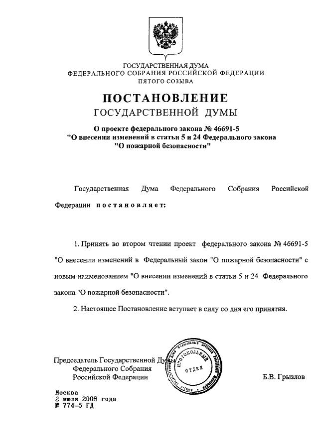 ПОСТАНОВЛЕНИЕ ГД ФС РФ от 02.07.2008 N 774-5 ГД