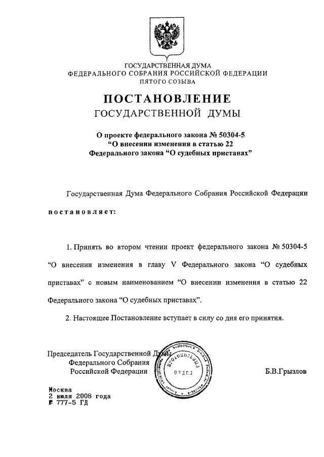 ПОСТАНОВЛЕНИЕ ГД ФС РФ от 02.07.2008 N 777-5 ГД