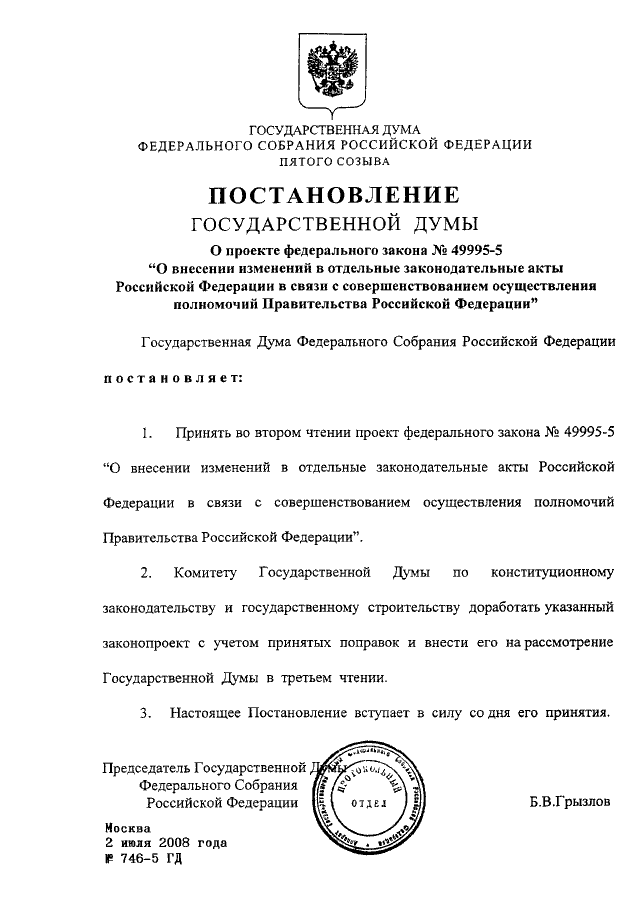 ПОСТАНОВЛЕНИЕ ГД ФС РФ от 02.07.2008 N 746-5 ГД