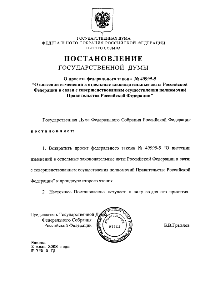 ПОСТАНОВЛЕНИЕ ГД ФС РФ от 02.07.2008 N 745-5 ГД