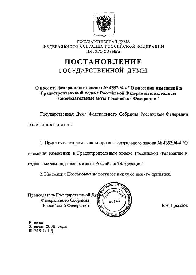 ПОСТАНОВЛЕНИЕ ГД ФС РФ от 02.07.2008 N 748-5 ГД