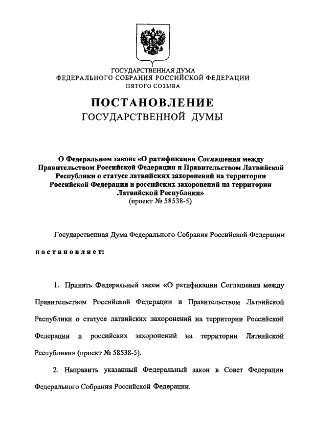 "О ФЕДЕРАЛЬНОМ ЗАКОНЕ "О РАТИФИКАЦИИ СОГЛАШЕНИЯ МЕЖДУ ПРАВИТЕЛЬСТВОМ РОССИЙСКОЙ ФЕДЕРАЦИИ И ПРАВИТЕЛЬСТВОМ ЛАТВИЙСКОЙ РЕСПУБЛИКИ О СТАТУСЕ ЛАТВИЙСКИХ ЗАХОРОНЕНИЙ НА ТЕРРИТОРИИ РОССИЙСКОЙ ФЕДЕРАЦИИ И РОССИЙСКИХ ЗАХОРОНЕНИЙ НА ТЕРРИТОРИИ ЛАТВИЙСКОЙ РЕСПУБЛИКИ" (ПРОЕКТ N 58538-5)"