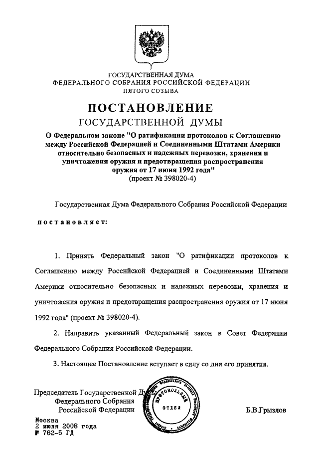ПОСТАНОВЛЕНИЕ ГД ФС РФ от 02.07.2008 N 762-5 ГД