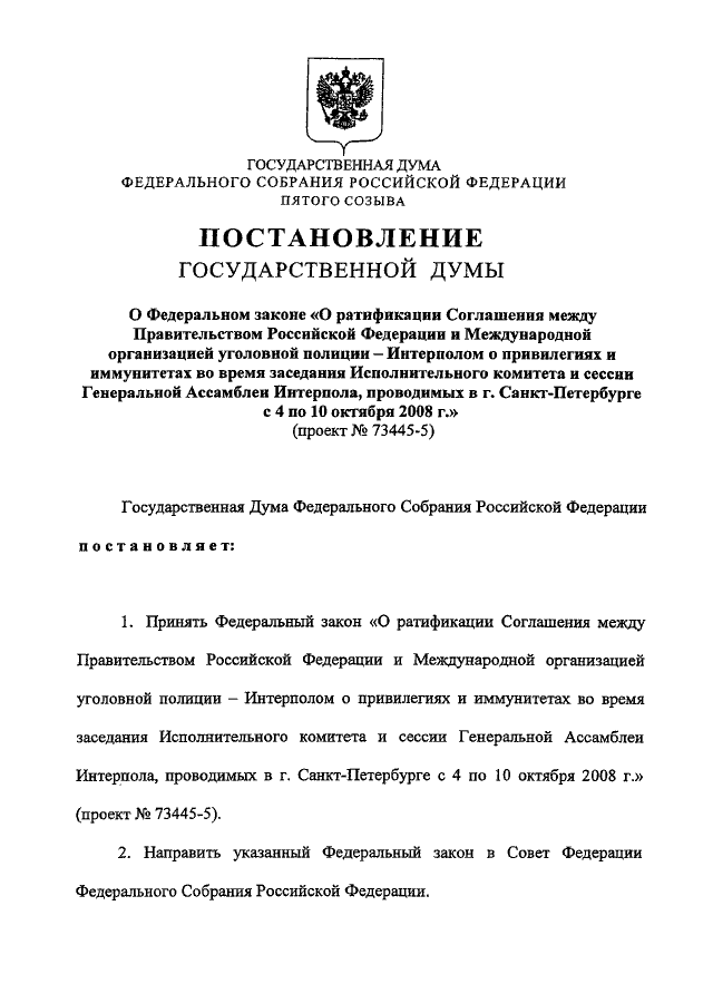 "О ФЕДЕРАЛЬНОМ ЗАКОНЕ "О РАТИФИКАЦИИ СОГЛАШЕНИЯ МЕЖДУ ПРАВИТЕЛЬСТВОМ РОССИЙСКОЙ ФЕДЕРАЦИИ И МЕЖДУНАРОДНОЙ ОРГАНИЗАЦИЕЙ УГОЛОВНОЙ ПОЛИЦИИ - ИНТЕРПОЛОМ О ПРИВИЛЕГИЯХ И ИММУНИТЕТАХ ВО ВРЕМЯ ЗАСЕДАНИЯ ИСПОЛНИТЕЛЬНОГО КОМИТЕТА И СЕССИИ ГЕНЕРАЛЬНОЙ АССАМБЛЕИ ИНТЕРПОЛА, ПРОВОДИМЫХ В Г. САНКТ-ПЕТЕРБУРГЕ С 4 ПО 10 ОКТЯБРЯ 2008 Г." (ПРОЕКТ N 73445-5)"