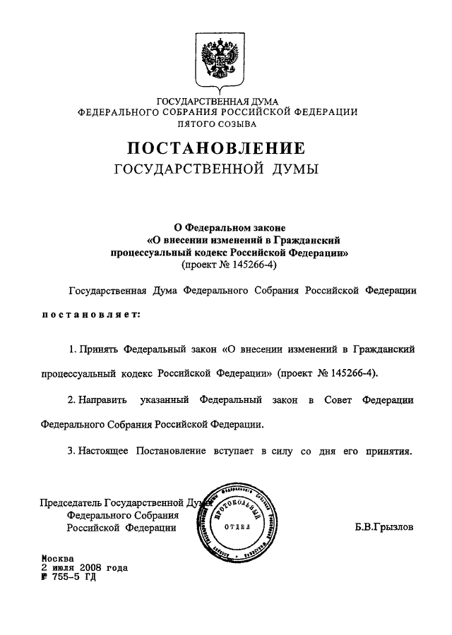 ПОСТАНОВЛЕНИЕ ГД ФС РФ от 02.07.2008 N 755-5 ГД