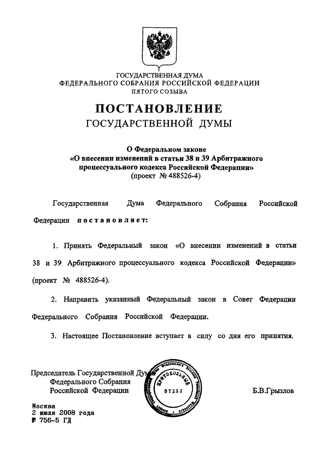 ПОСТАНОВЛЕНИЕ ГД ФС РФ от 02.07.2008 N 756-5 ГД