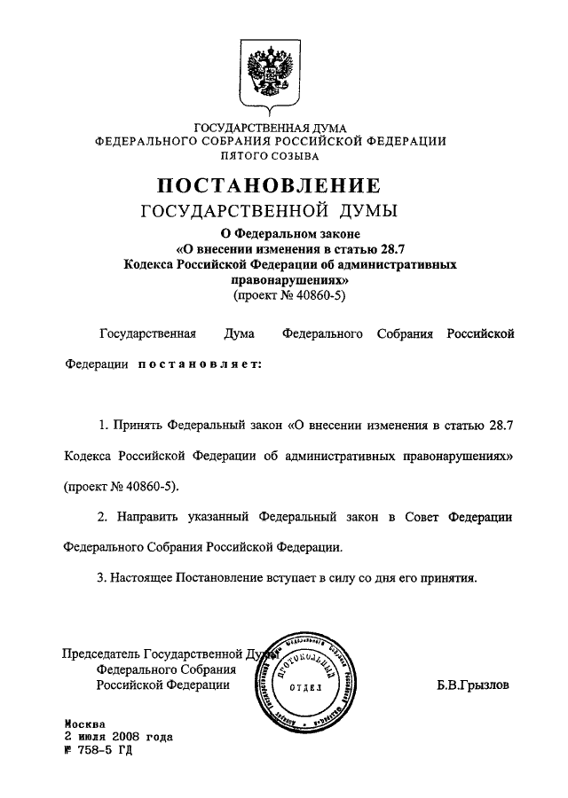 ПОСТАНОВЛЕНИЕ ГД ФС РФ от 02.07.2008 N 758-5 ГД