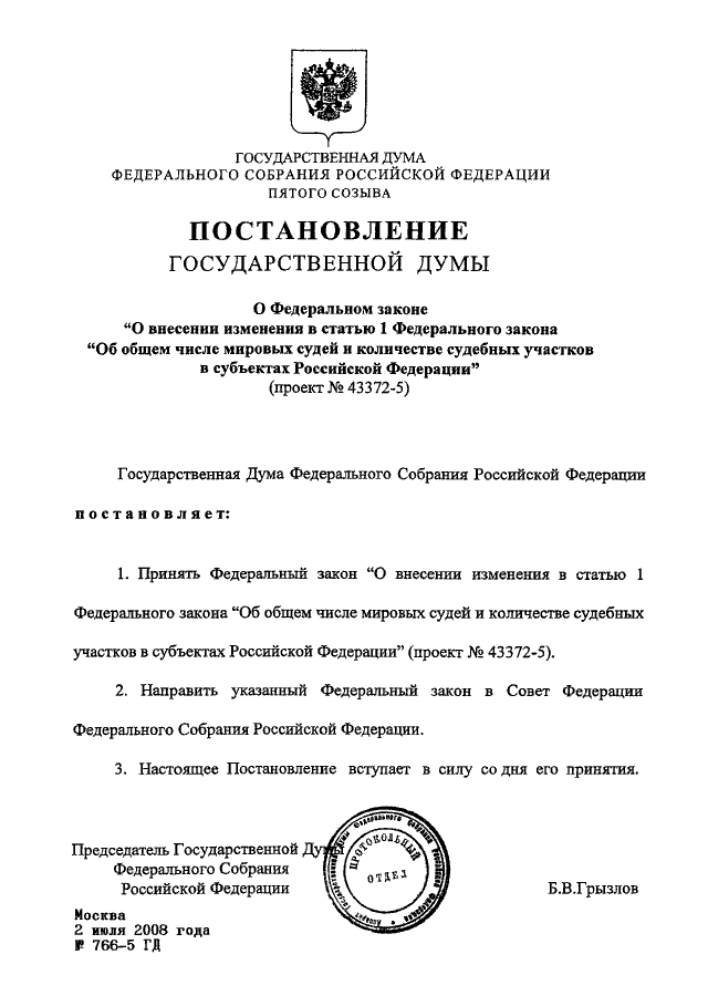 ПОСТАНОВЛЕНИЕ ГД ФС РФ от 02.07.2008 N 766-5 ГД