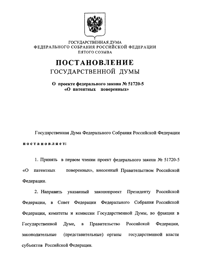 "О ПРОЕКТЕ ФЕДЕРАЛЬНОГО ЗАКОНА N 51720-5 "О ПАТЕНТНЫХ ПОВЕРЕННЫХ"