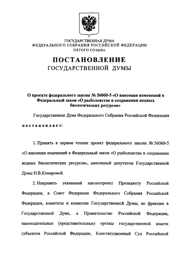"О ПРОЕКТЕ ФЕДЕРАЛЬНОГО ЗАКОНА N 56060-5 "О ВНЕСЕНИИ ИЗМЕНЕНИЙ В ФЕДЕРАЛЬНЫЙ ЗАКОН "О РЫБОЛОВСТВЕ И СОХРАНЕНИИ ВОДНЫХ БИОЛОГИЧЕСКИХ РЕСУРСОВ"