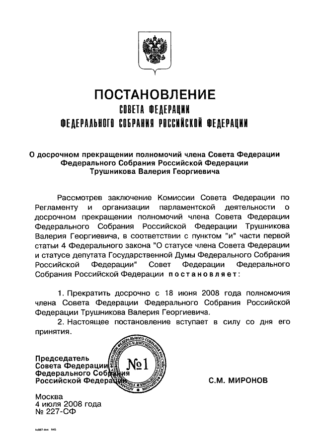 "О ДОСРОЧНОМ ПРЕКРАЩЕНИИ ПОЛНОМОЧИЙ ЧЛЕНА СОВЕТА ФЕДЕРАЦИИ ФЕДЕРАЛЬНОГО СОБРАНИЯ РОССИЙСКОЙ ФЕДЕРАЦИИ ТРУШНИКОВА ВАЛЕРИЯ ГЕОРГИЕВИЧА"