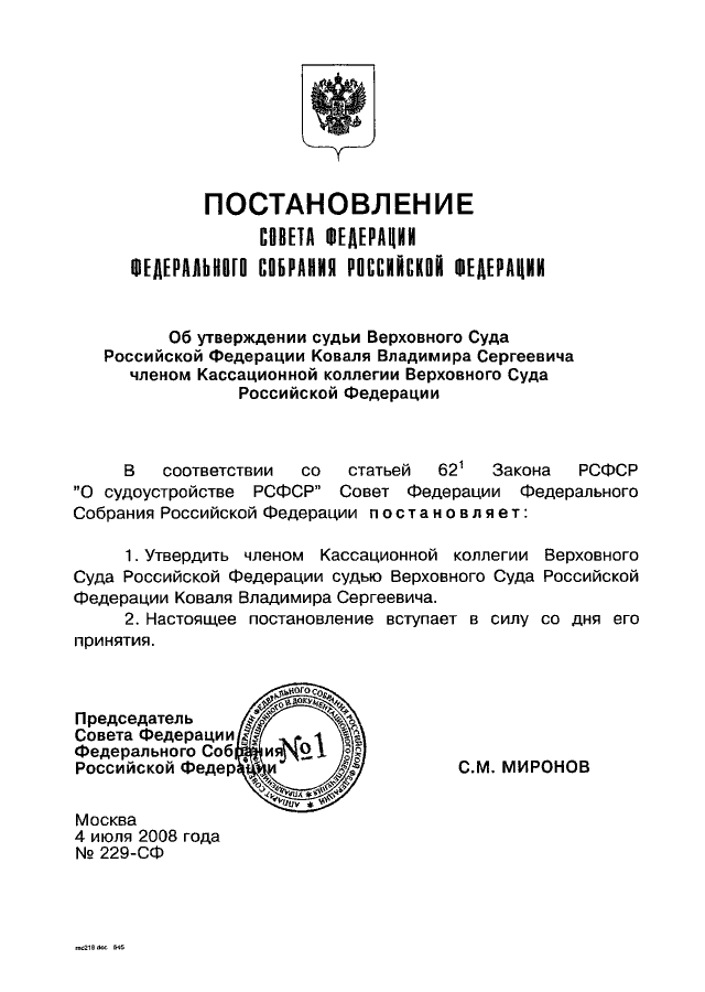 "ОБ УТВЕРЖДЕНИИ СУДЬИ ВЕРХОВНОГО СУДА РОССИЙСКОЙ ФЕДЕРАЦИИ КОВАЛЯ ВЛАДИМИРА СЕРГЕЕВИЧА ЧЛЕНОМ КАССАЦИОННОЙ КОЛЛЕГИИ ВЕРХОВНОГО СУДА РОССИЙСКОЙ ФЕДЕРАЦИИ"