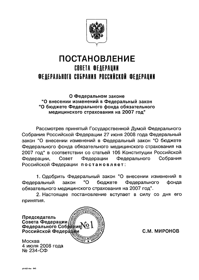 ПОСТАНОВЛЕНИЕ СФ ФС РФ от 04.07.2008 N 234-СФ