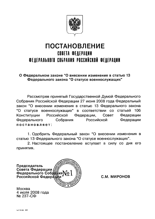 ПОСТАНОВЛЕНИЕ СФ ФС РФ от 04.07.2008 N 237-СФ