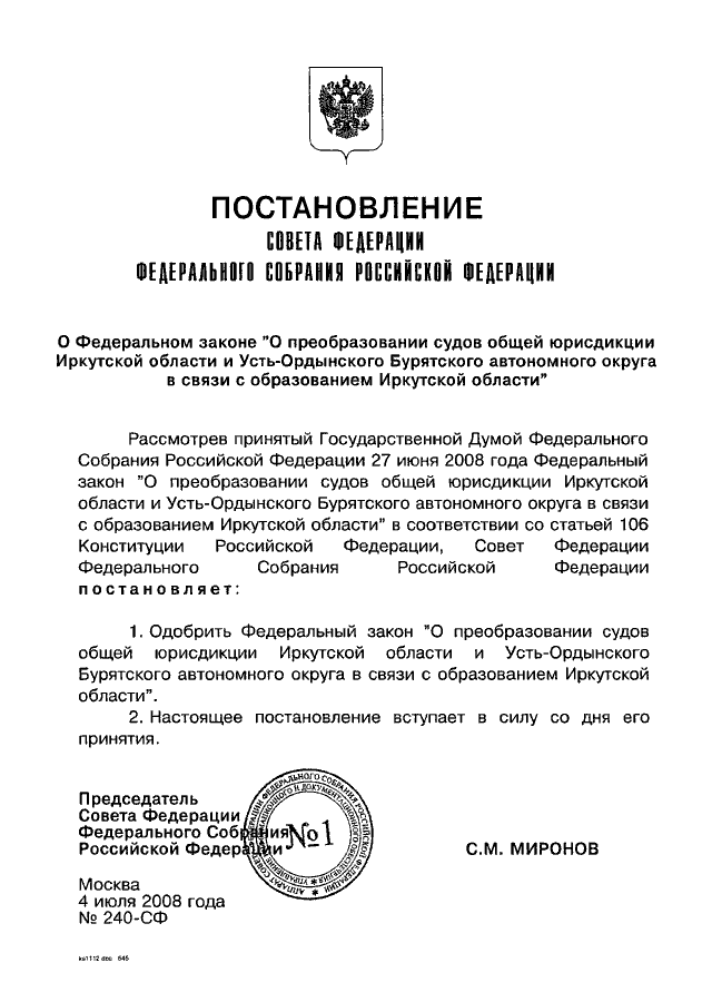 ПОСТАНОВЛЕНИЕ СФ ФС РФ от 04.07.2008 N 240-СФ