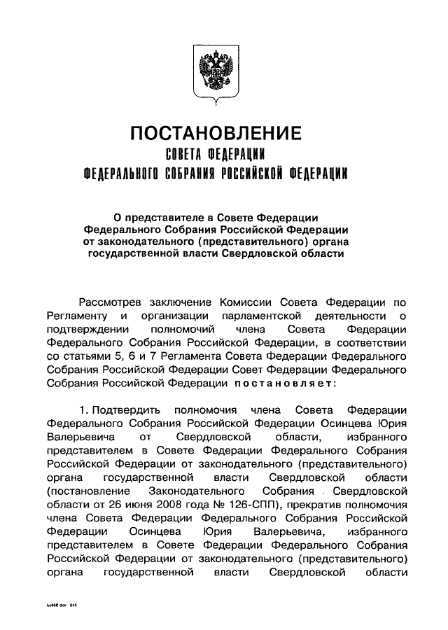 "О ПРЕДСТАВИТЕЛЕ В СОВЕТЕ ФЕДЕРАЦИИ ФЕДЕРАЛЬНОГО СОБРАНИЯ РОССИЙСКОЙ ФЕДЕРАЦИИ ОТ ЗАКОНОДАТЕЛЬНОГО (ПРЕДСТАВИТЕЛЬНОГО) ОРГАНА ГОСУДАРСТВЕННОЙ ВЛАСТИ СВЕРДЛОВСКОЙ ОБЛАСТИ"