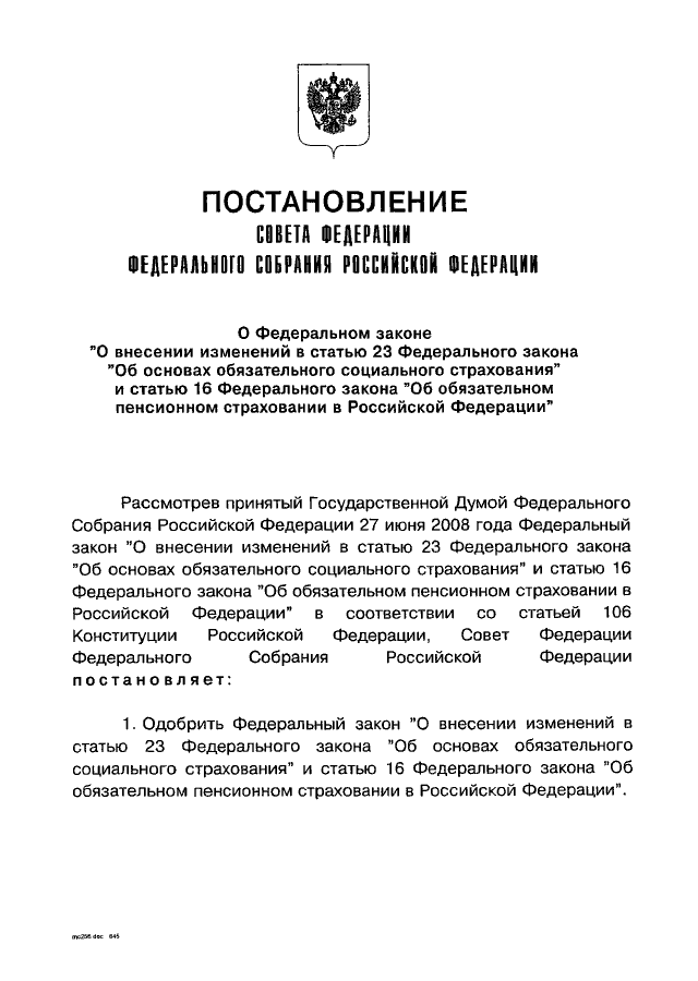 "О ФЕДЕРАЛЬНОМ ЗАКОНЕ "О ВНЕСЕНИИ ИЗМЕНЕНИЙ В СТАТЬЮ 23 ФЕДЕРАЛЬНОГО ЗАКОНА "ОБ ОСНОВАХ ОБЯЗАТЕЛЬНОГО СОЦИАЛЬНОГО СТРАХОВАНИЯ" И СТАТЬЮ 16 ФЕДЕРАЛЬНОГО ЗАКОНА "ОБ ОБЯЗАТЕЛЬНОМ ПЕНСИОННОМ СТРАХОВАНИИ В РОССИЙСКОЙ ФЕДЕРАЦИИ"