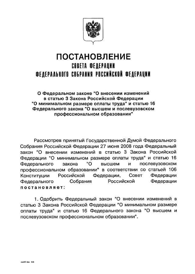 "О ФЕДЕРАЛЬНОМ ЗАКОНЕ "О ВНЕСЕНИИ ИЗМЕНЕНИЙ В СТАТЬЮ 3 ЗАКОНА РОССИЙСКОЙ ФЕДЕРАЦИИ "О МИНИМАЛЬНОМ РАЗМЕРЕ ОПЛАТЫ ТРУДА" И СТАТЬЮ 16 ФЕДЕРАЛЬНОГО ЗАКОНА "О ВЫСШЕМ И ПОСЛЕВУЗОВСКОМ ПРОФЕССИОНАЛЬНОМ ОБРАЗОВАНИИ"