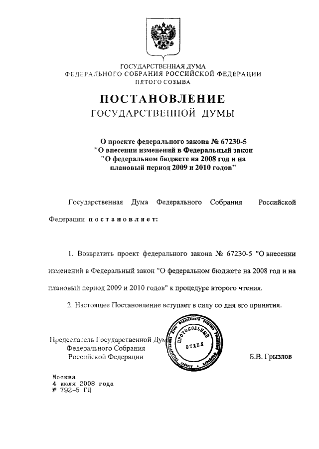ПОСТАНОВЛЕНИЕ ГД ФС РФ от 04.07.2008 N 792-5 ГД