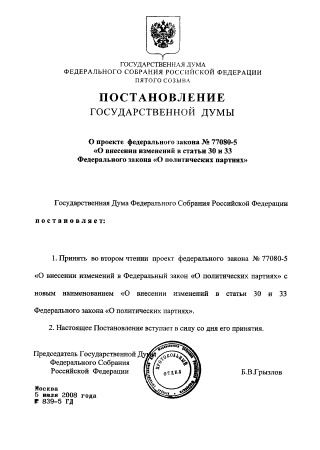 ПОСТАНОВЛЕНИЕ ГД ФС РФ от 05.07.2008 N 839-5 ГД