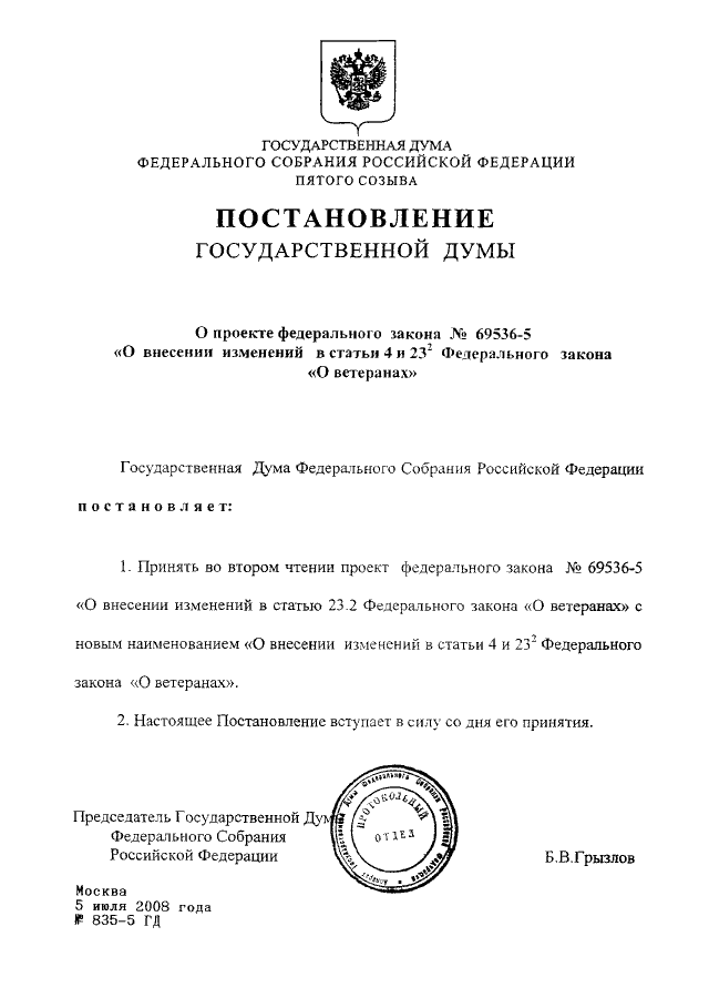 ПОСТАНОВЛЕНИЕ ГД ФС РФ от 05.07.2008 N 835-5 ГД