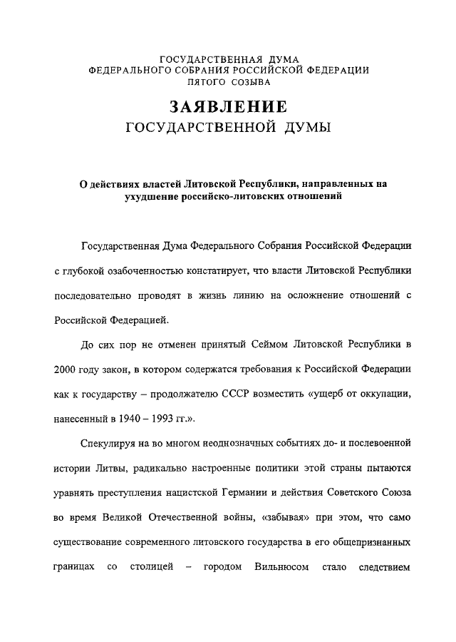 "О ЗАЯВЛЕНИИ ГОСУДАРСТВЕННОЙ ДУМЫ ФЕДЕРАЛЬНОГО СОБРАНИЯ РОССИЙСКОЙ ФЕДЕРАЦИИ "О ДЕЙСТВИЯХ ВЛАСТЕЙ ЛИТОВСКОЙ РЕСПУБЛИКИ, НАПРАВЛЕННЫХ НА УХУДШЕНИЕ РОССИЙСКО - ЛИТОВСКИХ ОТНОШЕНИЙ"