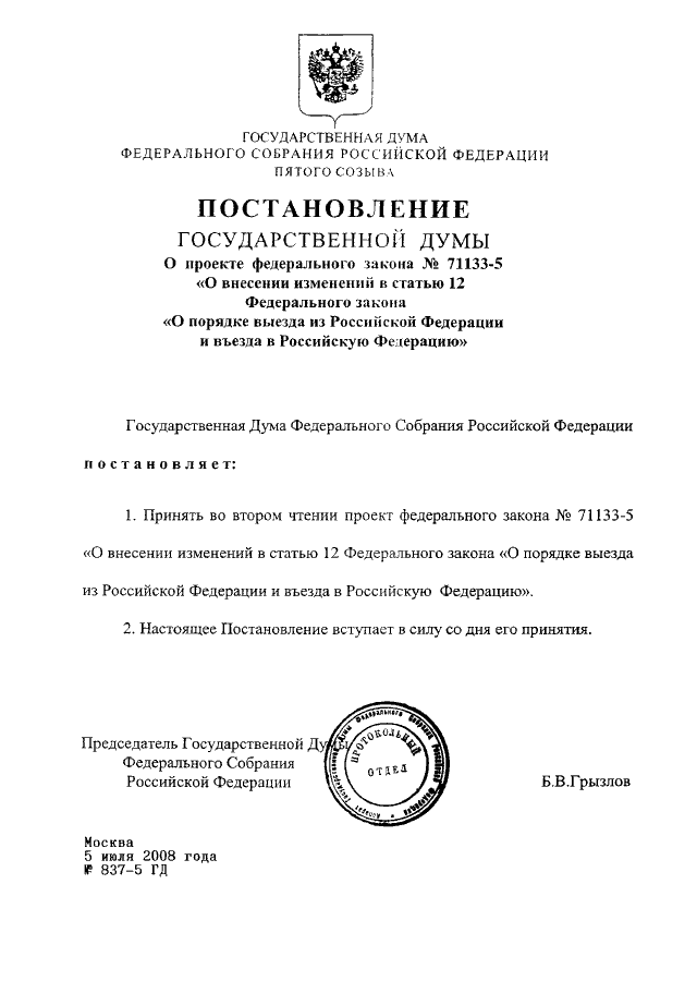 ПОСТАНОВЛЕНИЕ ГД ФС РФ от 05.07.2008 N 837-5 ГД