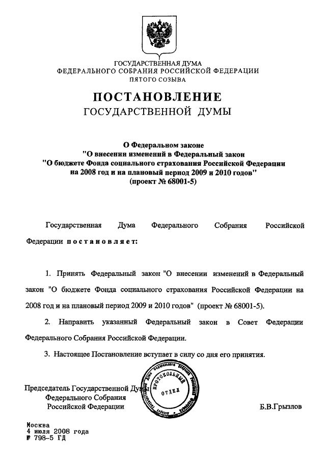 ПОСТАНОВЛЕНИЕ ГД ФС РФ от 04.07.2008 N 798-5 ГД