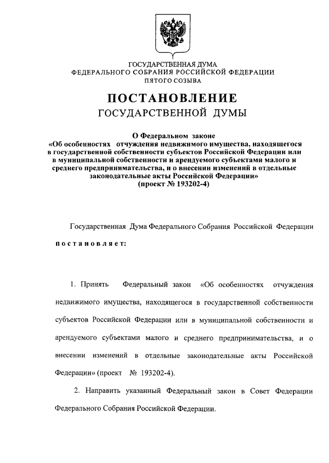 "О ФЕДЕРАЛЬНОМ ЗАКОНЕ "ОБ ОСОБЕННОСТЯХ ОТЧУЖДЕНИЯ НЕДВИЖИМОГО ИМУЩЕСТВА, НАХОДЯЩЕГОСЯ В ГОСУДАРСТВЕННОЙ СОБСТВЕННОСТИ СУБЪЕКТОВ РОССИЙСКОЙ ФЕДЕРАЦИИ ИЛИ В МУНИЦИПАЛЬНОЙ СОБСТВЕННОСТИ И АРЕНДУЕМОГО СУБЪЕКТАМИ МАЛОГО И СРЕДНЕГО ПРЕДПРИНИМАТЕЛЬСТВА, И О ВНЕСЕНИИ ИЗМЕНЕНИЙ В ОТДЕЛЬНЫЕ ЗАКОНОДАТЕЛЬНЫЕ АКТЫ РОССИЙСКОЙ ФЕДЕРАЦИИ" (ПРОЕКТ N 193202-4)"