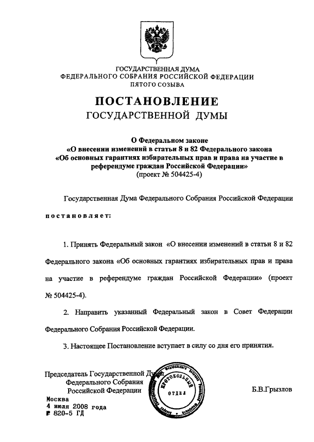 ПОСТАНОВЛЕНИЕ ГД ФС РФ от 04.07.2008 N 820-5 ГД
