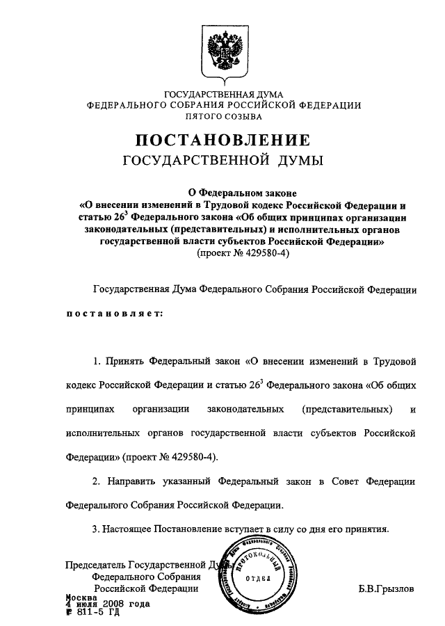 ПОСТАНОВЛЕНИЕ ГД ФС РФ от 04.07.2008 N 811-5 ГД