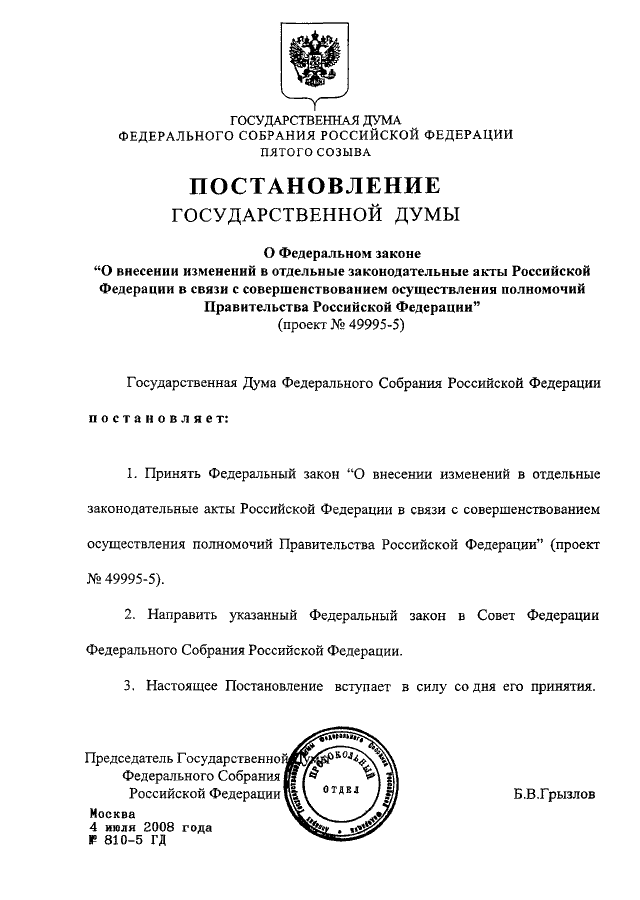ПОСТАНОВЛЕНИЕ ГД ФС РФ от 04.07.2008 N 810-5 ГД
